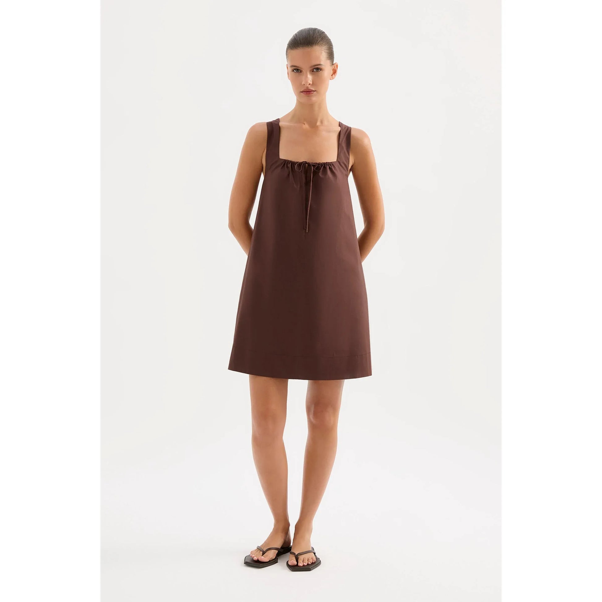 The Alexis Mini Dress is made from a cotton poplin which has be washed for a smooth, crisp hand feel. The silhouette is feminine and relaxed with a square, gathered neckline and soft billowing skirt finishing mini in length. Features include tie at front and side seam pockets.