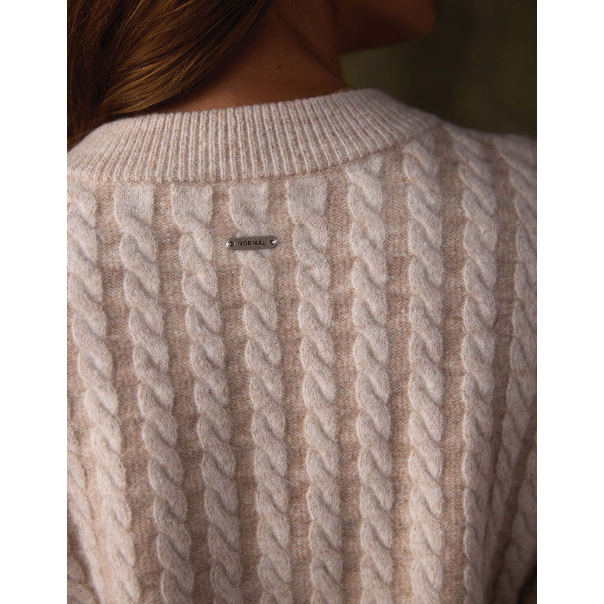 Rib at neck opening. All over engineered placed cable design. Dropped shoulders. Rib sleeve cuffs. Hi-low curved hem. Side slits. Rib bottom band. Engraved metal bar.