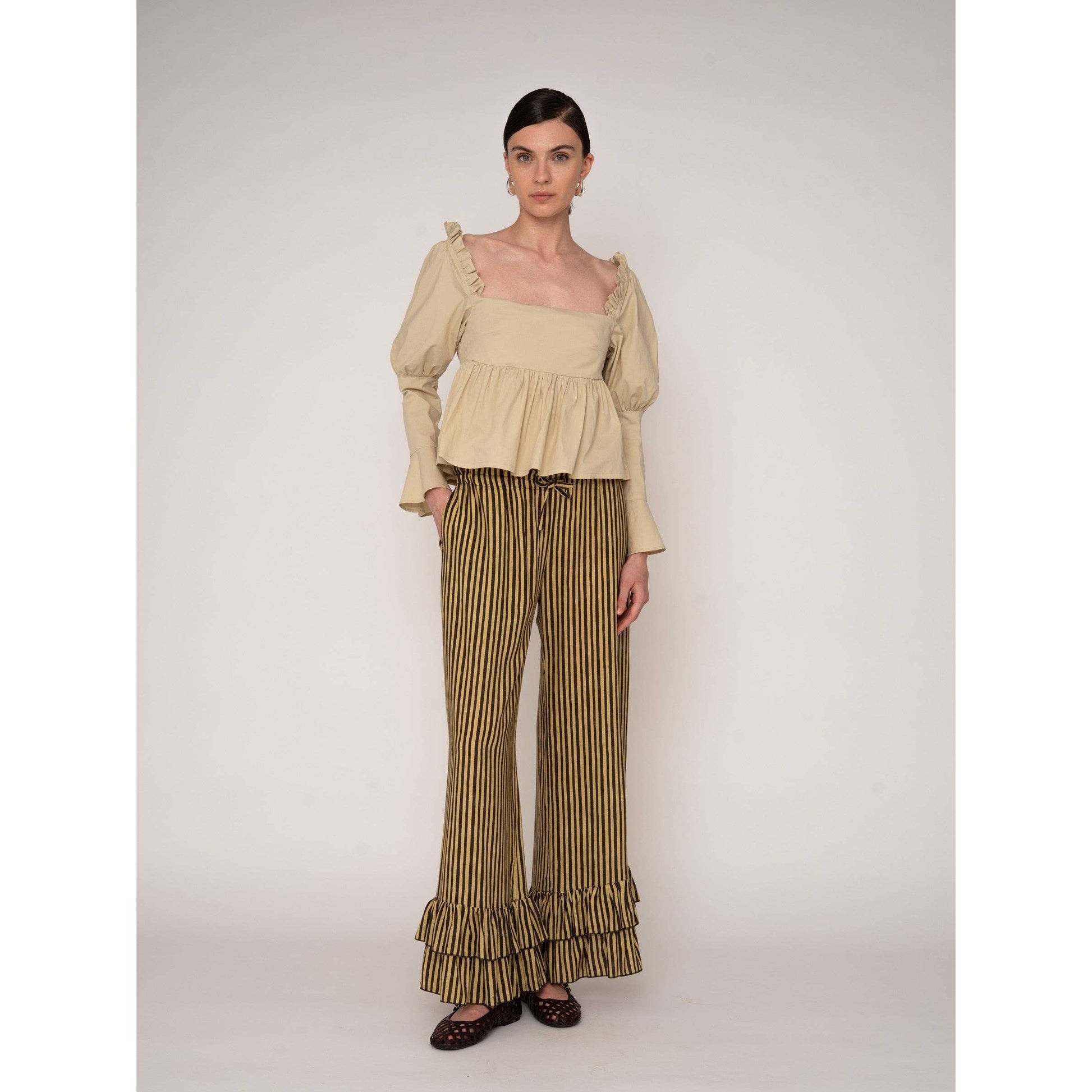 Beige blouse with square neckline and ruffles on the shoulders. Long puffy sleeves that end in flared cuffs. Gently adjusted under the bust, with peplum-type fall. Open back with decorative bow.