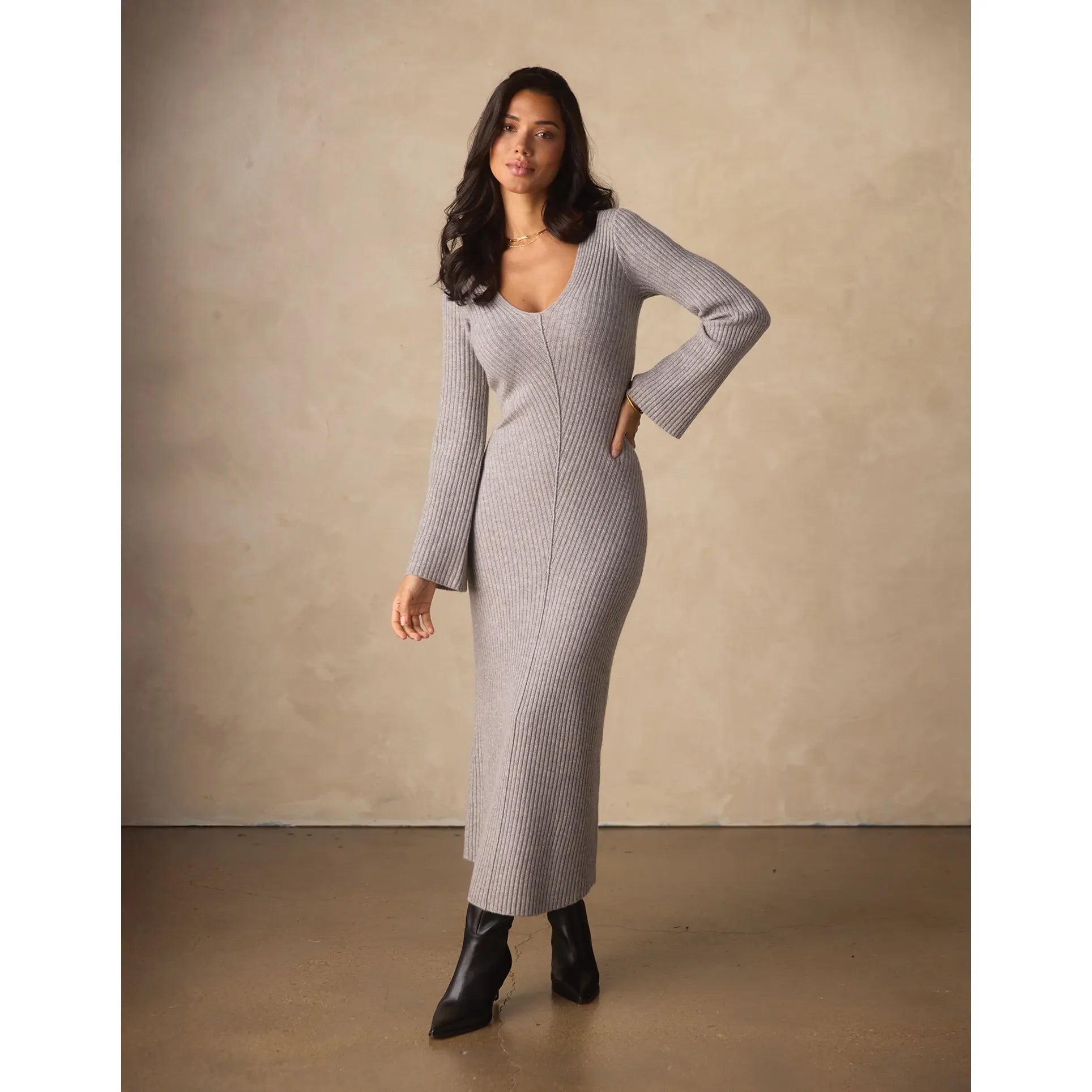 The Collins Knit Maxi Dress is soft, stretchy, and easy to wear—one of those pieces that looks put together without even trying. With its flattering V-neck, ribbed texture, and flowy A-line skirt, it moves with you and feels just as good as it looks. Finished with subtle seam details and a true-to-size fit for that effortlessly polished vibe.