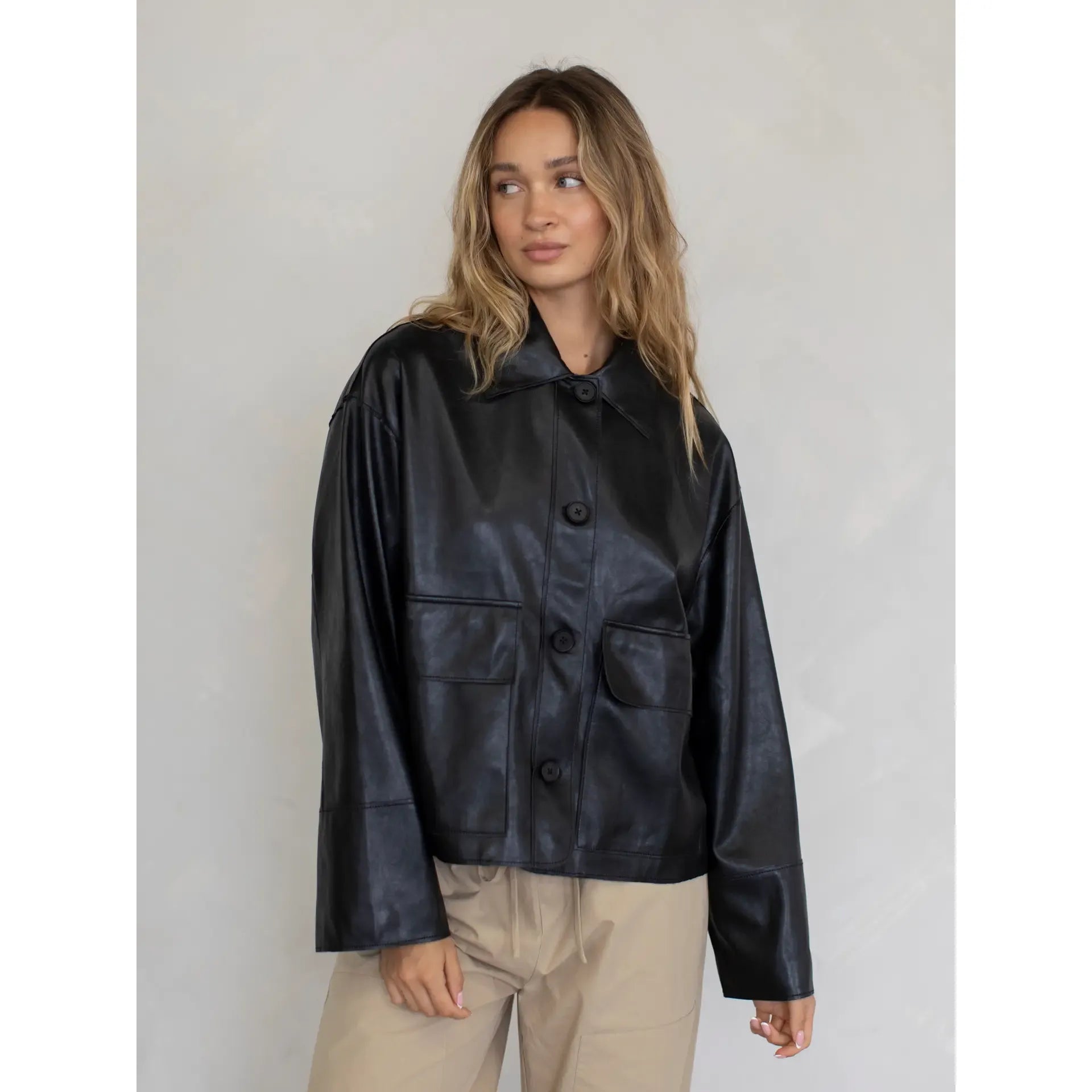 A modern essential with a touch of edge. Crafted from soft faux leather, this jacket’s waist ties let you customize your fit while adding shape and style. Ideal for day-to-night outfits.