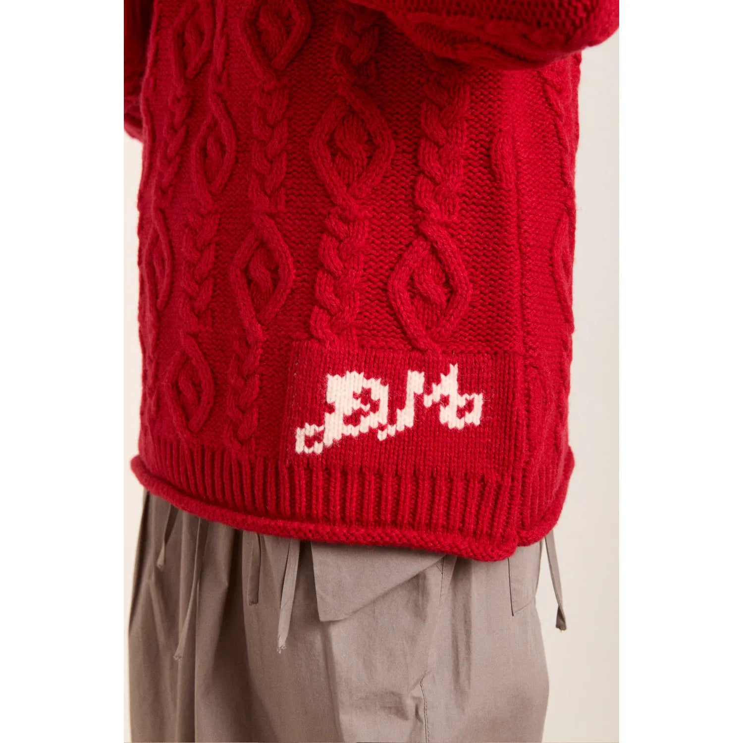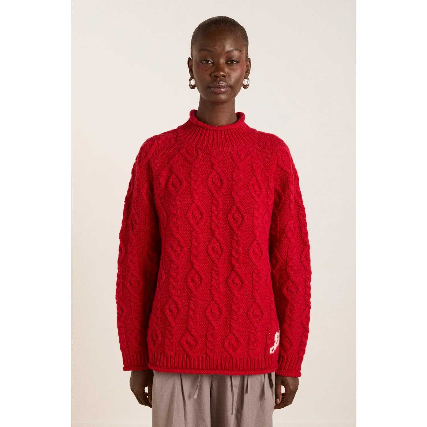 This chunky cable knit jumper brings effortless comfort with its oversized fit and cozy texture. Made from 100% certified responsible wool standard Wool, it’s finished with a subtle DM motif at the hem. A quiet nod to detail in a timeless winter staple.