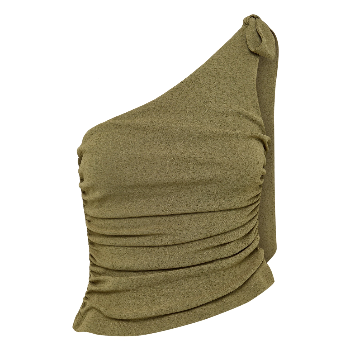 The Fiora Mesh Top is made from a stretch jersey with a dry hand feel. The silhouette is a form fitting top with an asymmetric hem. Features include a one shoulder neckline with tie at shoulder and soft draped gathering across the body. This top is fully lined.