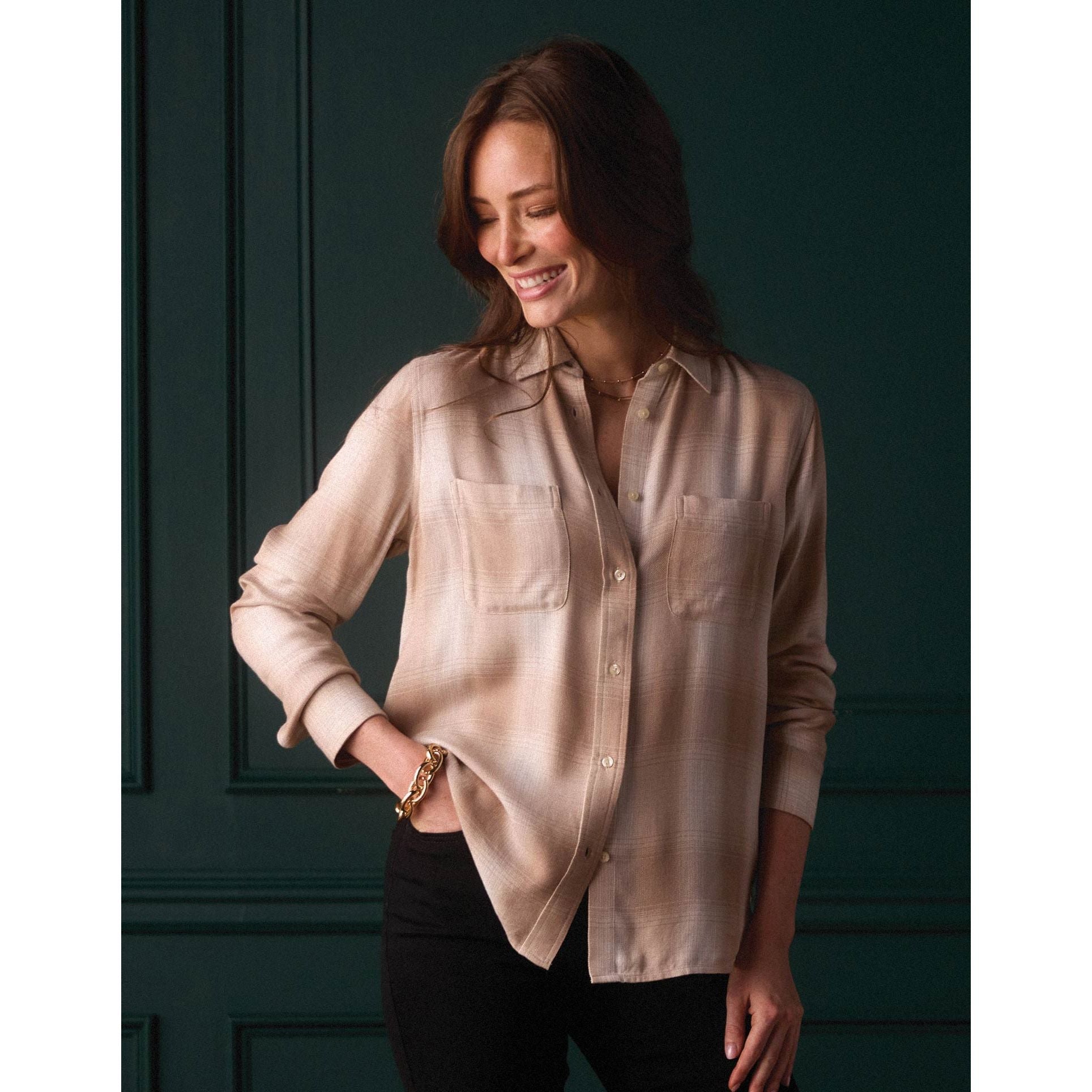 Meet Harper. Relaxed and drapey, perfect for casual wear. Made from 100% EcoVero Viscose, the fabric is extremely soft with a slightly brushed flannel texture and a subtle sheen. It features a relaxed fit that hits at the hip, 2 chest pockets, a shirt collar, front button placket, back yoke with box pleat, sleeve cuffs with vents, and a curved hem. Ideal for layering over a tee or under a jacket, it offers versatile styling for any casual occasion.