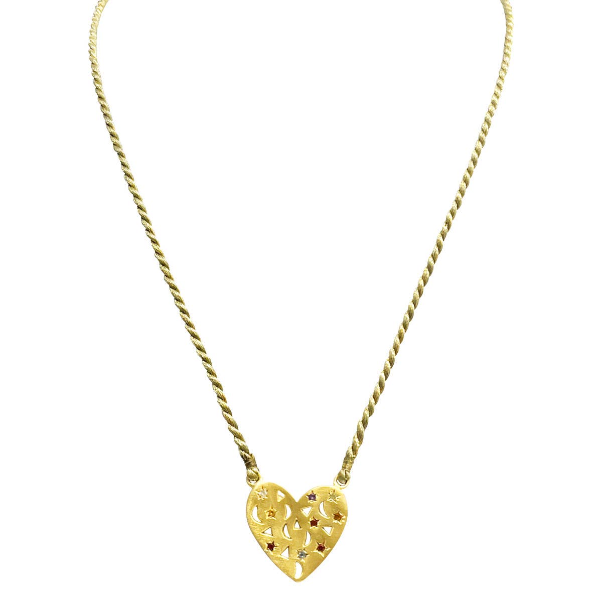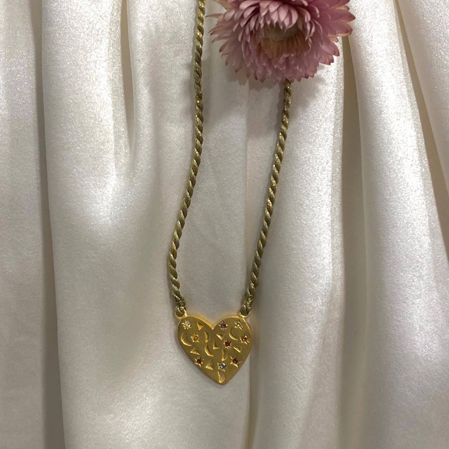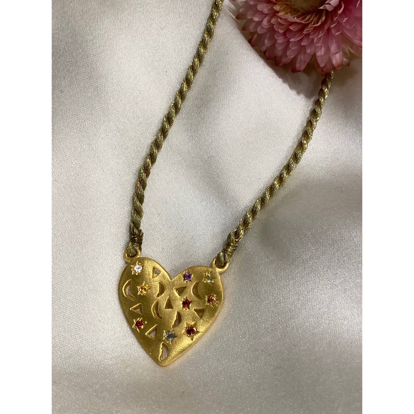3 micron matt gold-plated heart medal necklace The heart is inlaid with small gemstones of various colors. Closure with 1 sliding bow. the thread is khaki mixed with a gold thread. We love the look of matt gold, which blends perfectly with the brilliance of the stones.