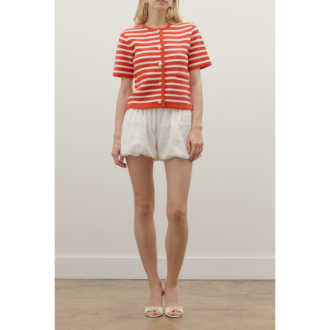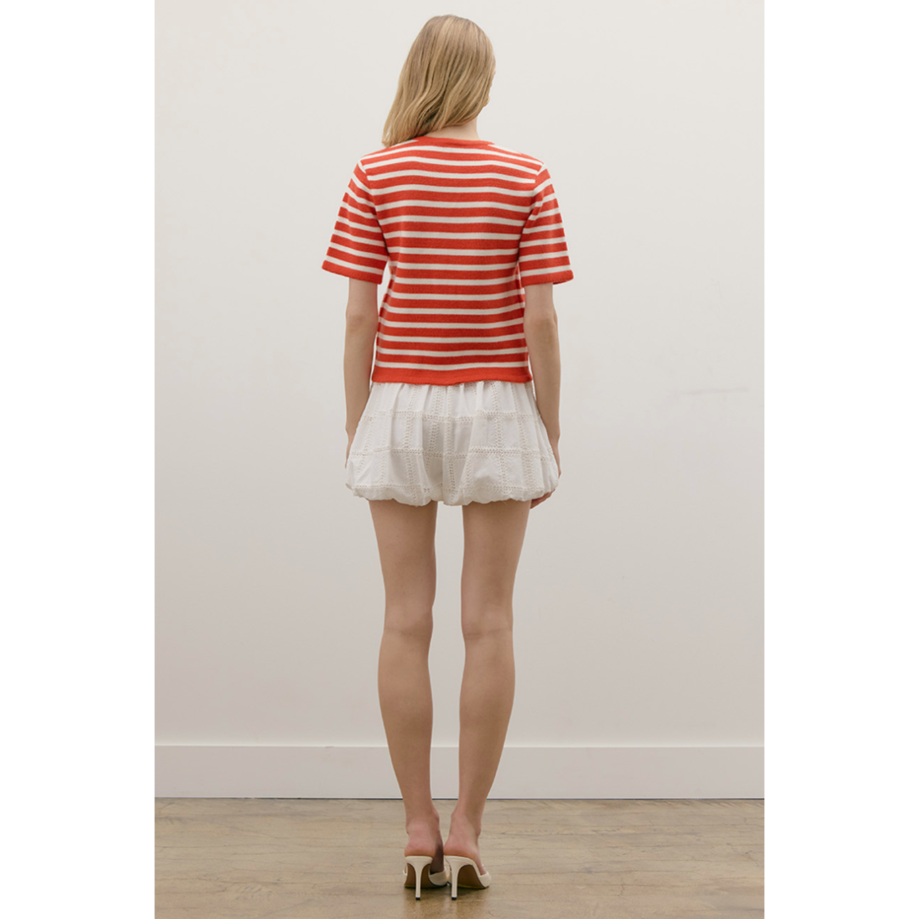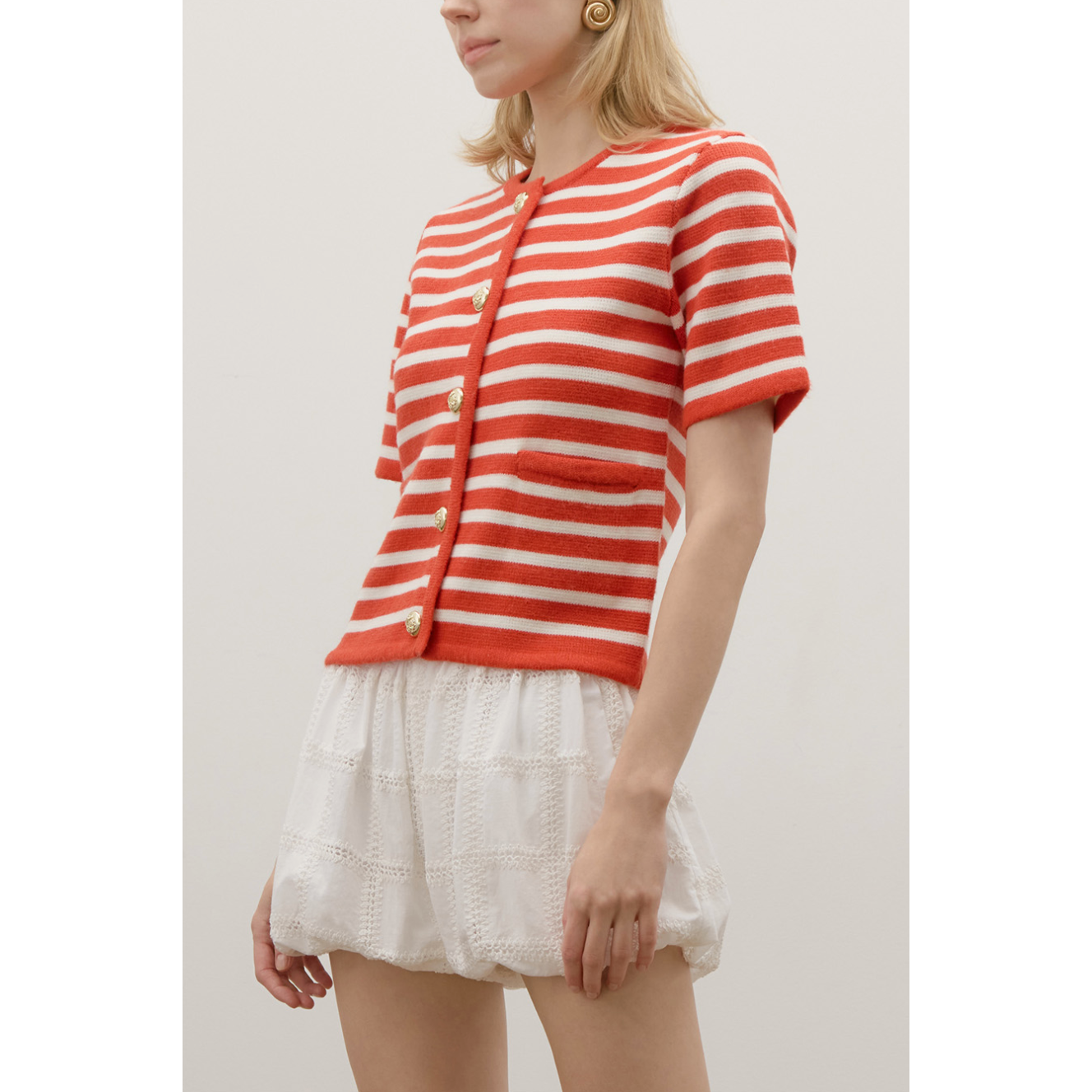Brighten your summer wardrobe with our Newport Summer Top! This adorable short sleeve sweater features eye-catching red and white stripes that scream seaside chic. The beautiful gold buttons add a touch of nautical elegance to this playful piece. Perfect for breezy evenings or air-conditioned cafés when you need just a hint of warmth without sacrificing style!