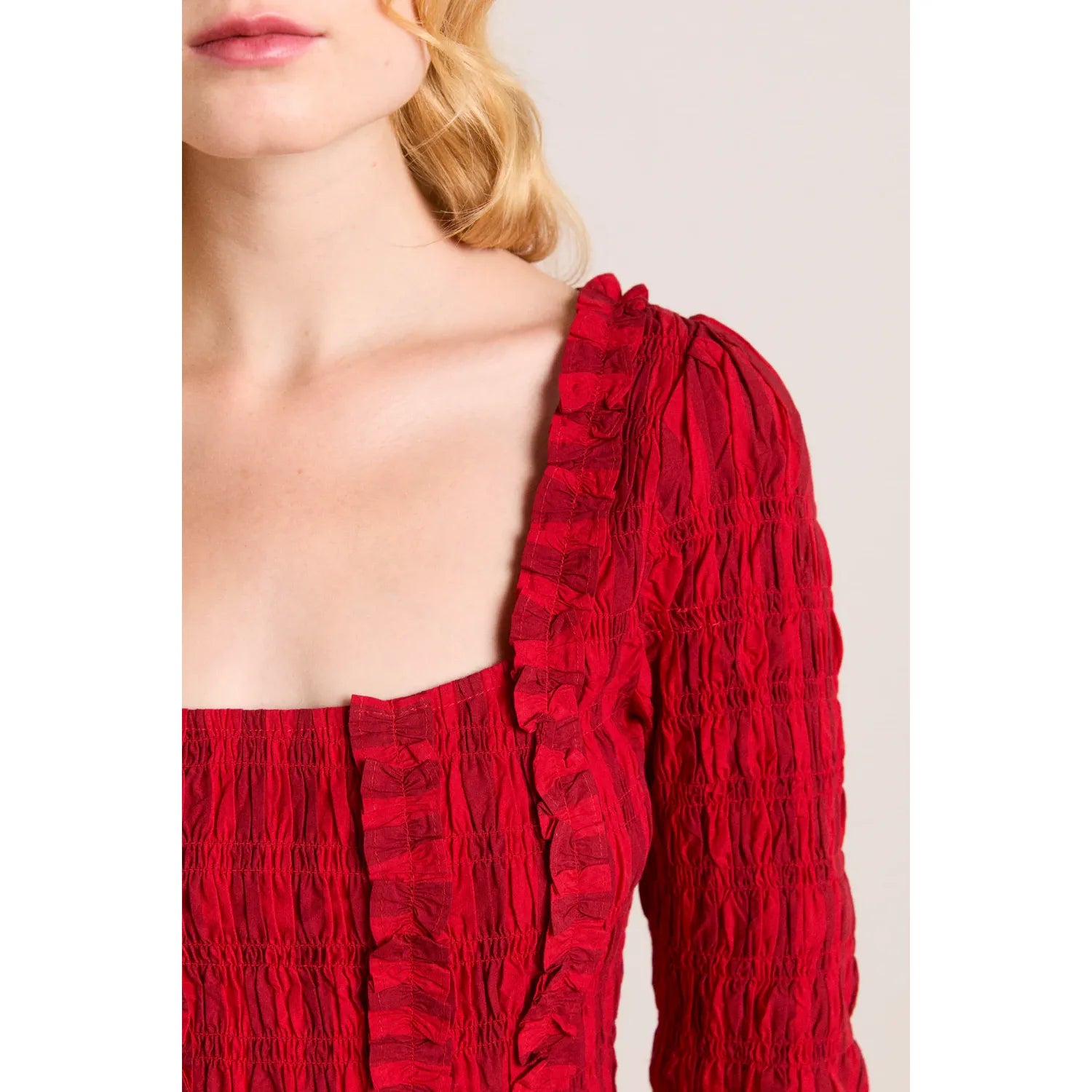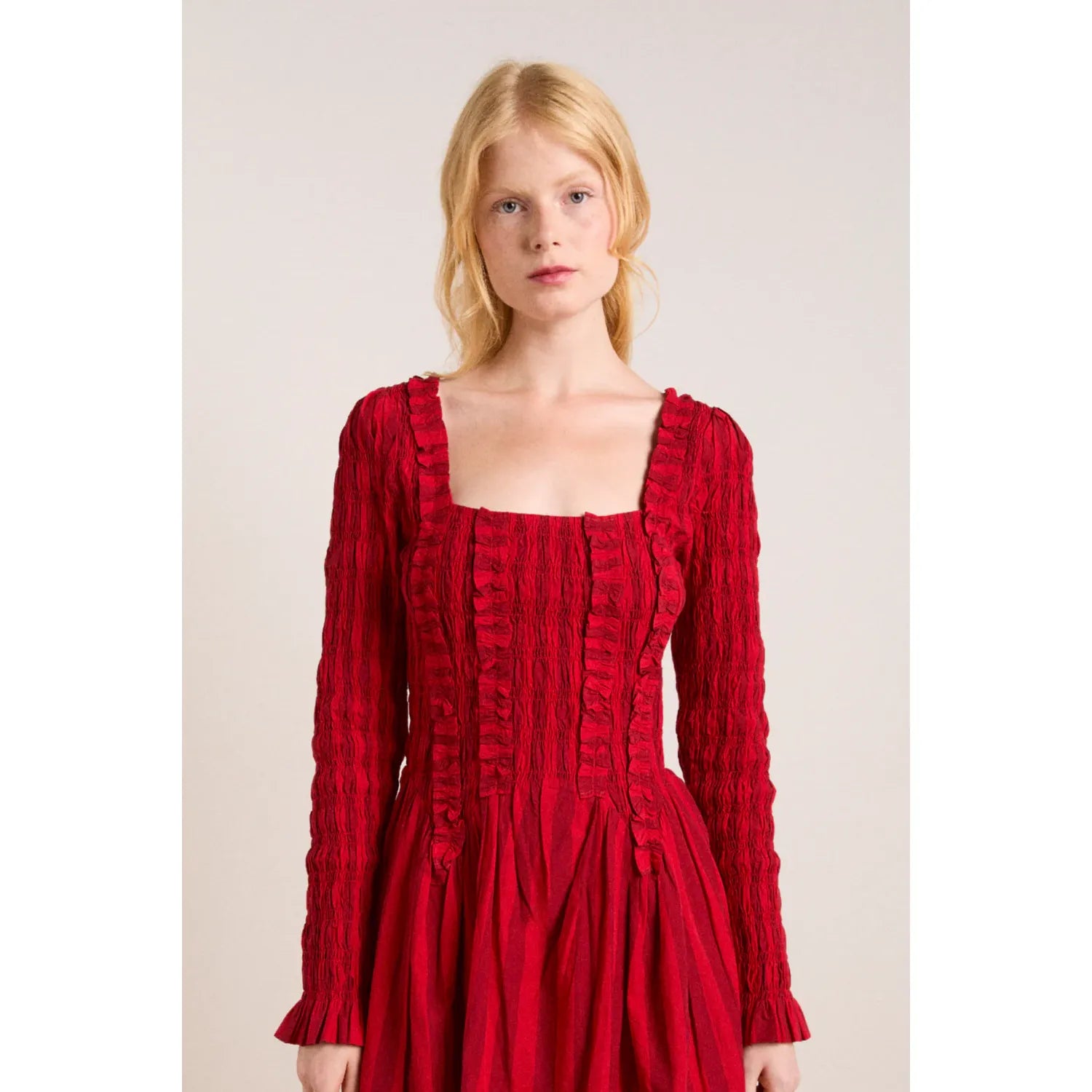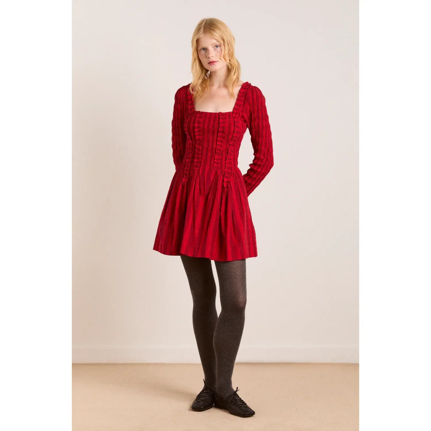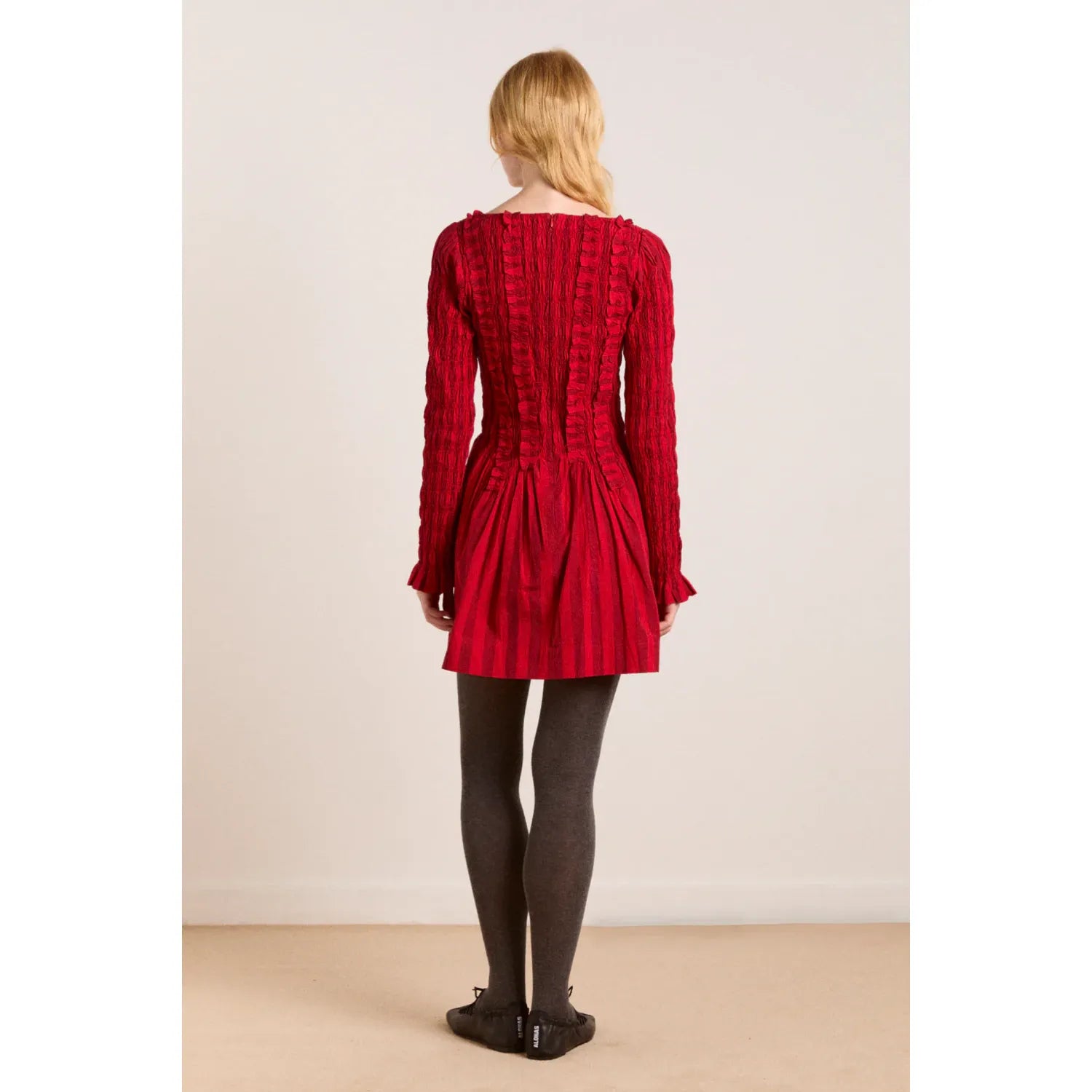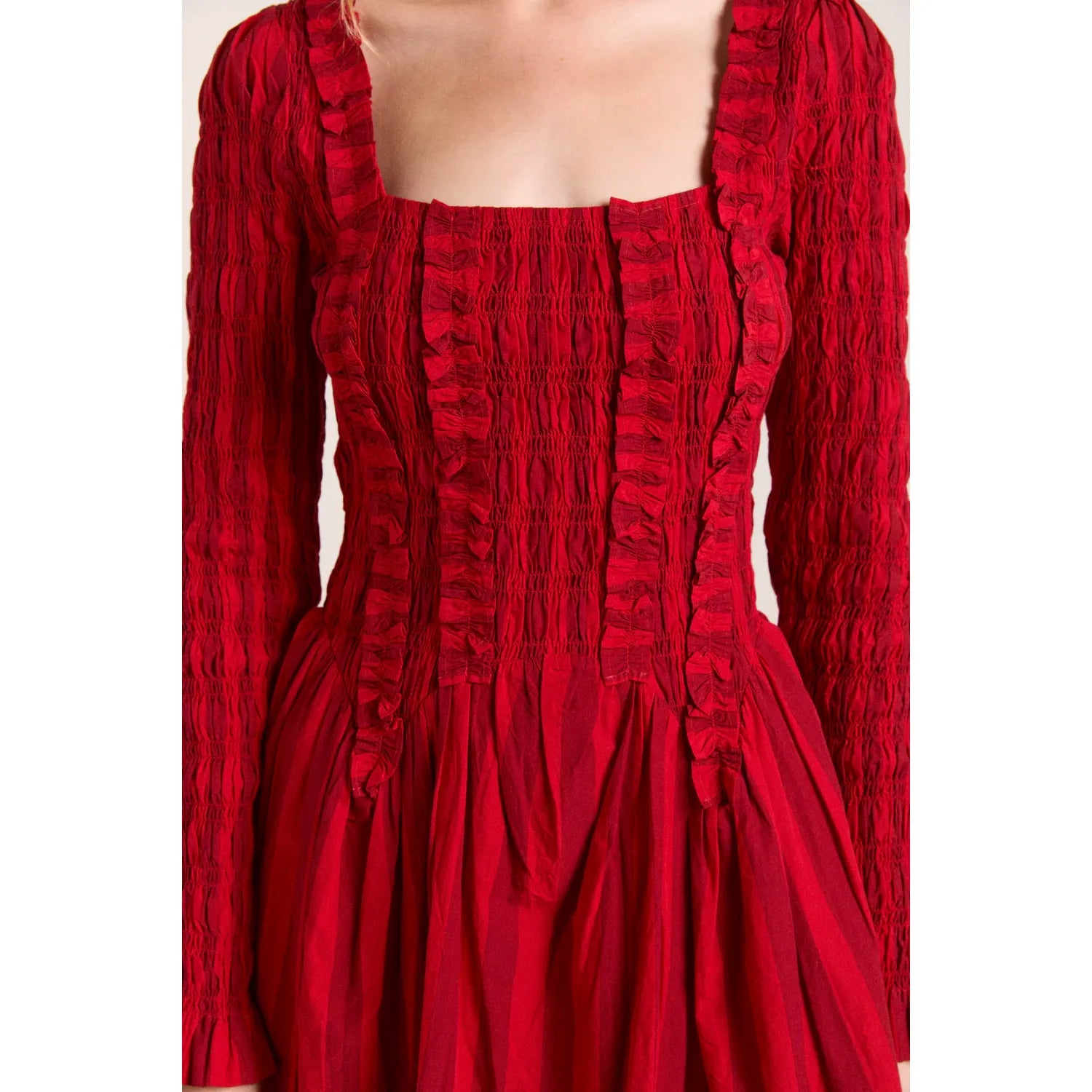 Flirty and fun, the Raphaela Mini Dress in red stripe is adorned with an all over stripe print and ruffle detailing. Featuring a square neck and shirred bodice for a flattering fit. Matching accessories available.