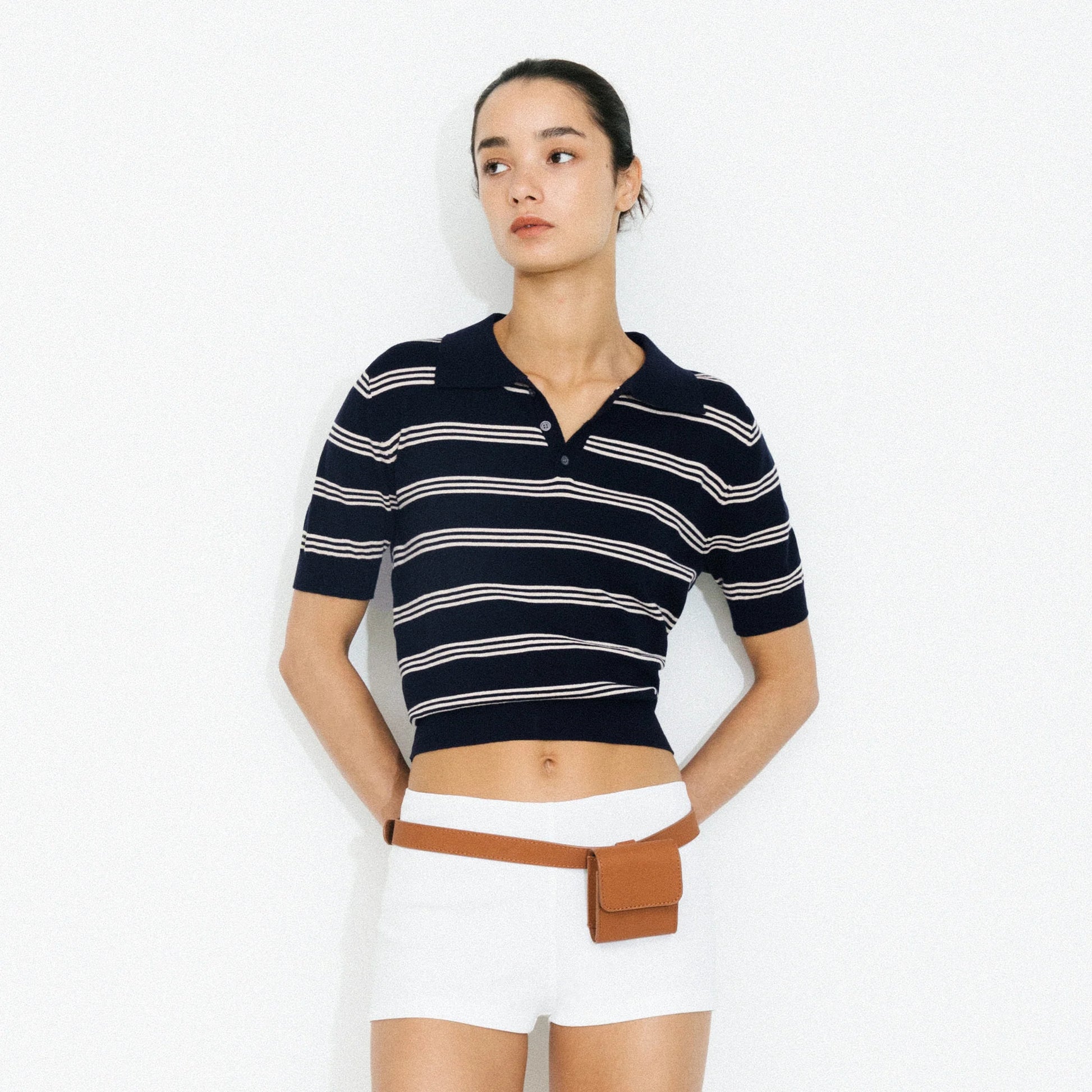 Striped cropped polo collar t-shirt in navy. Designed in a relaxed cropped silhouette, this T-shirt features a classic polo collar and stripe pattern. A laid-back essential with a sporty twist, perfect for effortless everyday wear. The fabric composition is 100% cotton.
