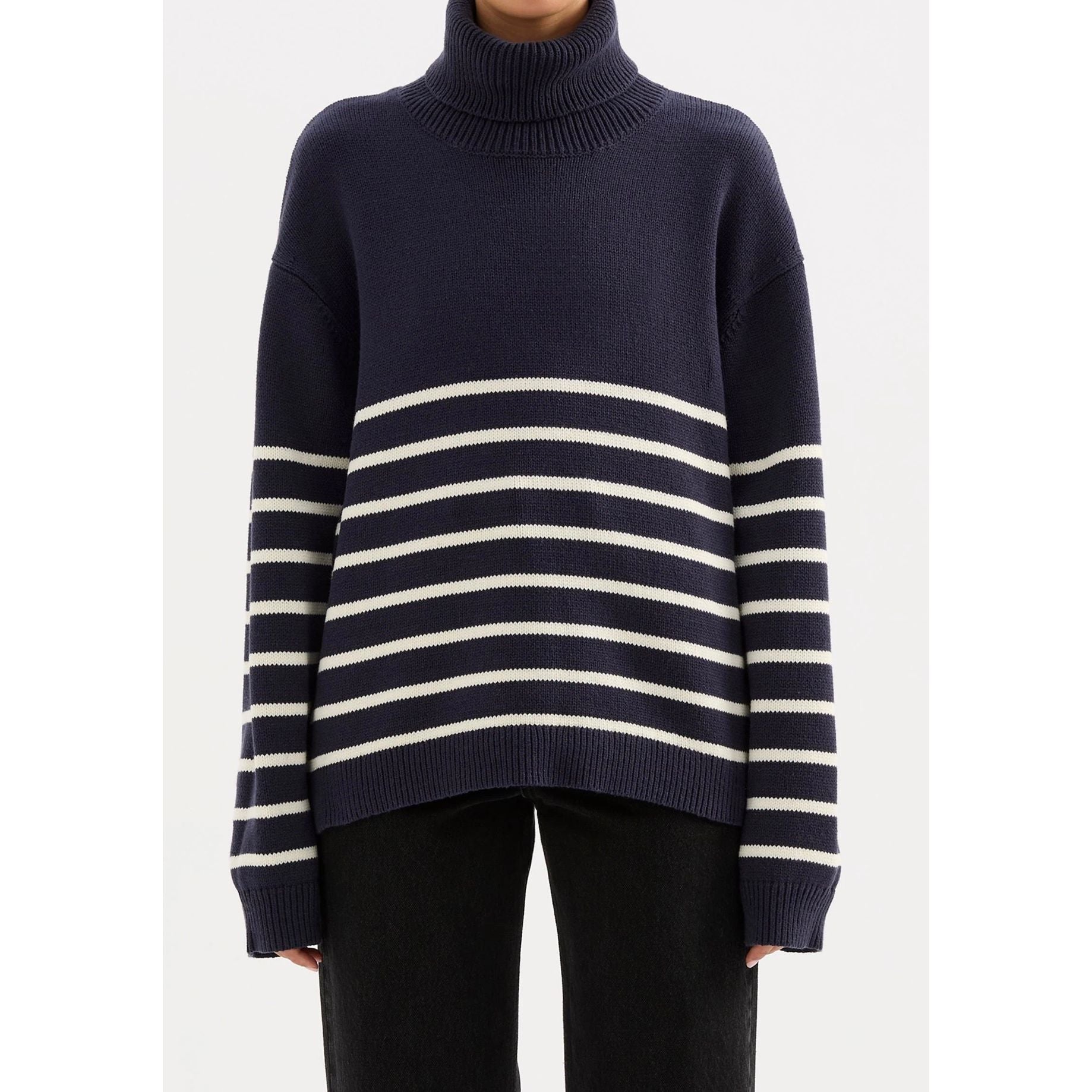 The Venus Turtleneck Knit is made from a cotton blend yarn with a soft hand feel. The silhouette is relaxed with a dropped shoulder, and length finishing below the hips. Features include fold over turtleneck, placement stripe design, ribbed collar, cuff and hem.