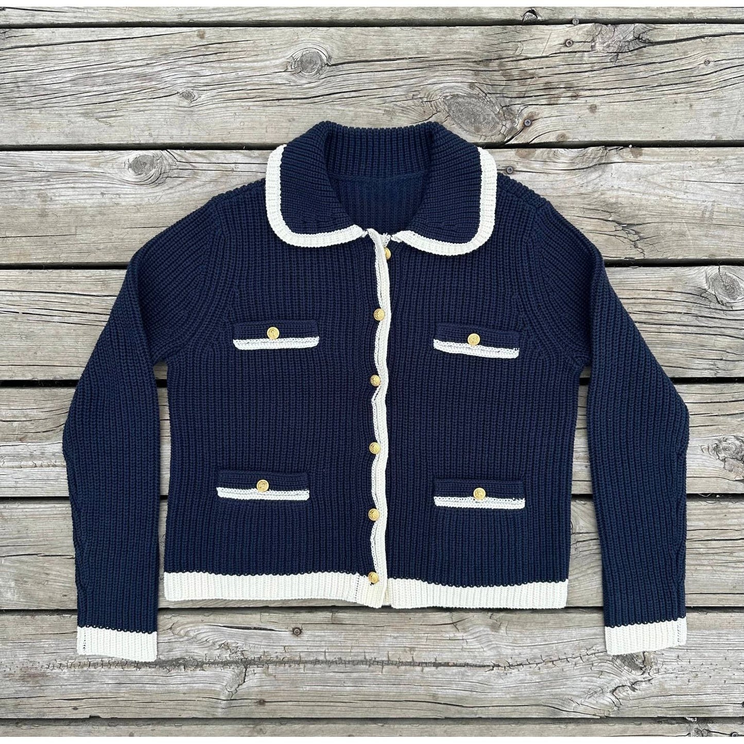 Indulge in the luxury of our Ocean Drive Cardigan. This cute knit cardigan, with its elegant collar and gold buttons, will elevate any outfit. The rich navy color adds a touch of sophistication, making it a must-have for any fashion-forward wardrobe.